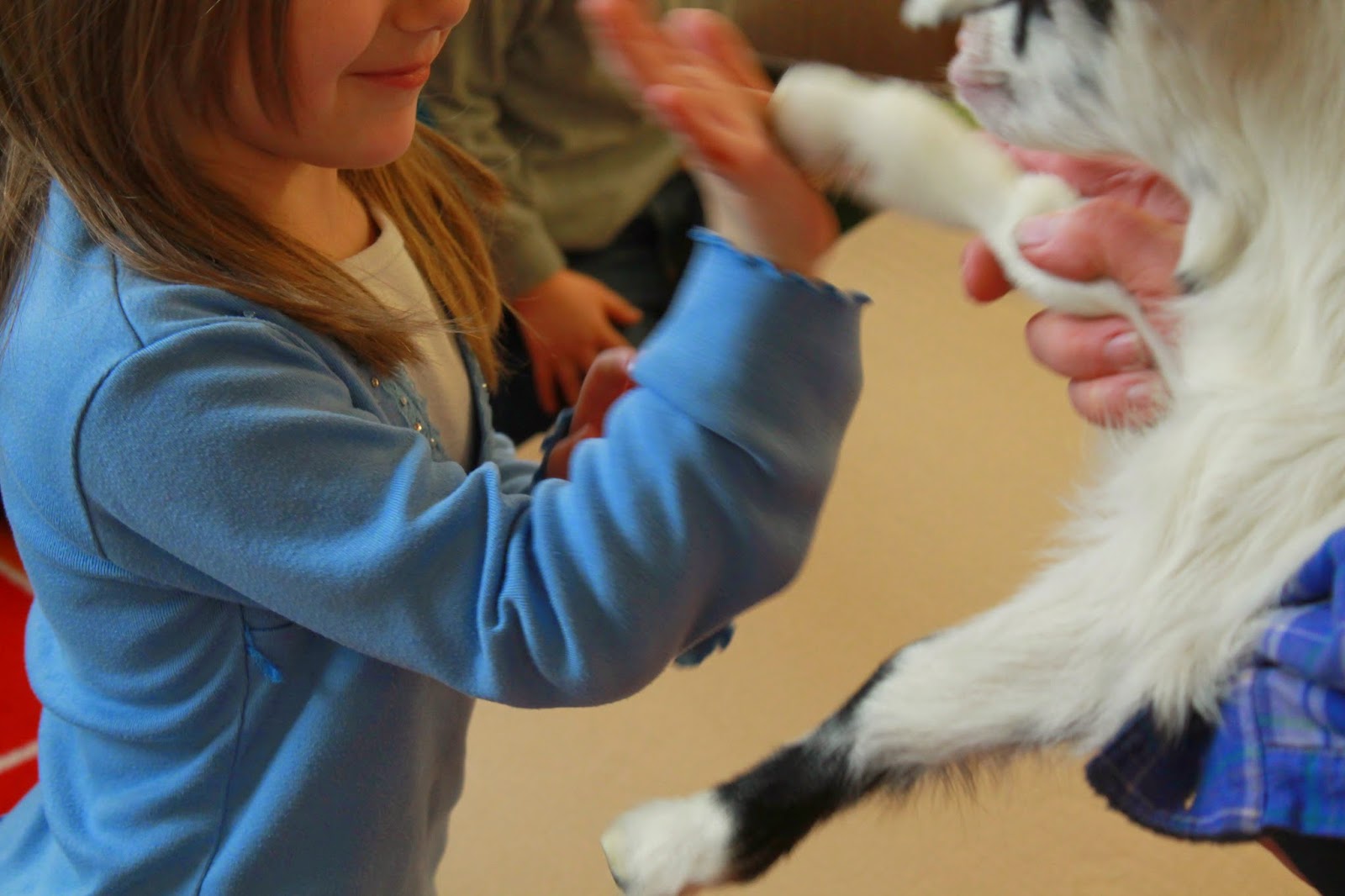 The children did so well containing their excitement in order to be calm and quiet when the goats were with us! The little fur babies pranced from child to child, wagging their little tails, nibbling on ears and fingers, and trying to climb on everything and everyone. They were certainly adorable!